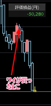 そして現在保有のポジションはマイナス1万円です。三井ES上げてきたな・・・ワイのロスカットした株価よりも上げてるわ。そんな気はしたんや。ワイはすぐにポジション取るのは辞めたほうがいいね。もう少しじっくり待ってから入ったほうが良いわ。上げるパターン手のがあるやろ・・・そういうことやで!