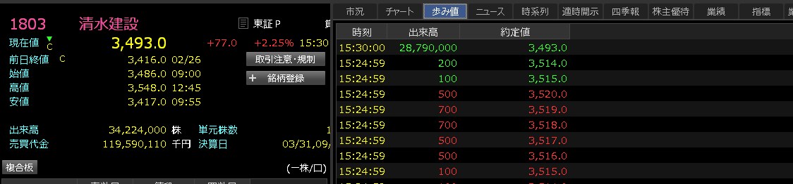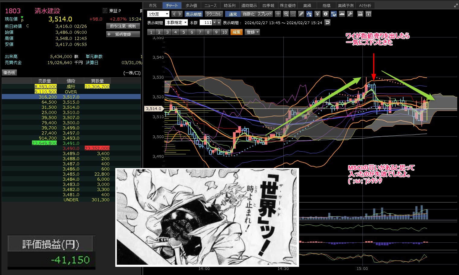 マジで◯ネヨ・・・20円以上下げるってアホやろ!MSCIはもうやらん。困難なあかんわ。Geminiに騙されたわ。今日の取引は以下のとおりです。引けピンやのに・・・清水建設は引けドンですよ。ほんまに建設セクター合わんわ。くそやわ。清水建設・・・自分が情けない。
