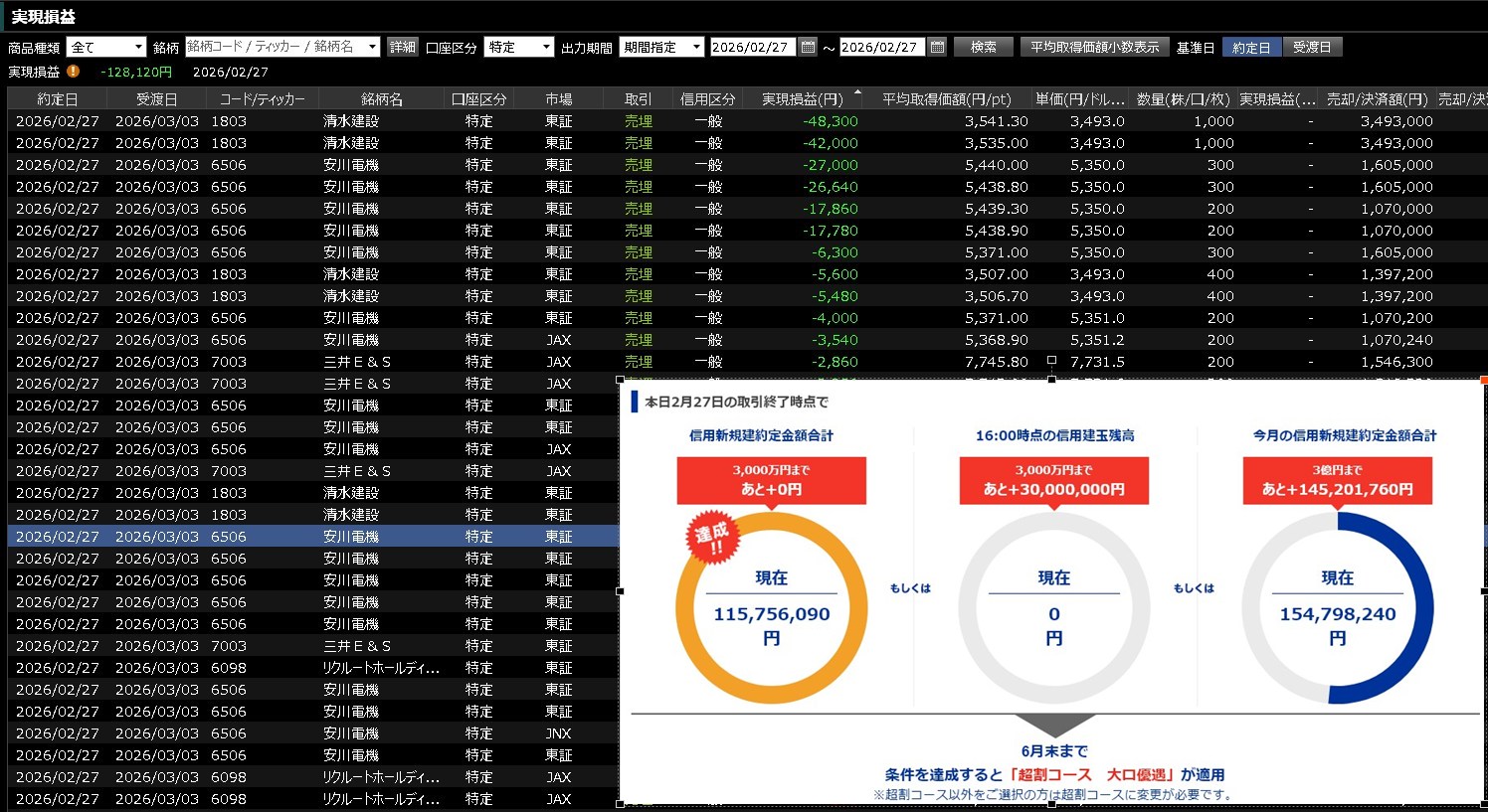 後場が始まりました。とりあえず6月末まで大型優遇が適用されうようだ・・・信用金利も高いから最近は一般信用を使ってます。ワイの信用取引が大きいので優遇金利で2.1%です。優遇がなければ2.8%・・・信用取引はやるなら1日信用ですね。デイトレは現引きできる範囲で1日信用を回すのがいいね。現金決済できなくなる場合があるから現物取引は最後に持ち越す場合のみ適用した方が良いね。にしても前場の安川10万円のロスカットには心折られたわ。