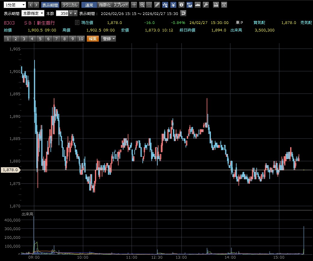 本日のデイトレ結果と日経平均の1分足は以下のとおりです。優待を二銘柄取りましたのでそれをPTSで処分して2万円以上損してましたが本日処分してたらもっと損してましたね。とりあえず、デイトレでいくらか抜きましたがSGホールディングスとか全然動かんかったわ。こういう銘柄は合わないね。って思ってます。結局ロスカットでしたからね。