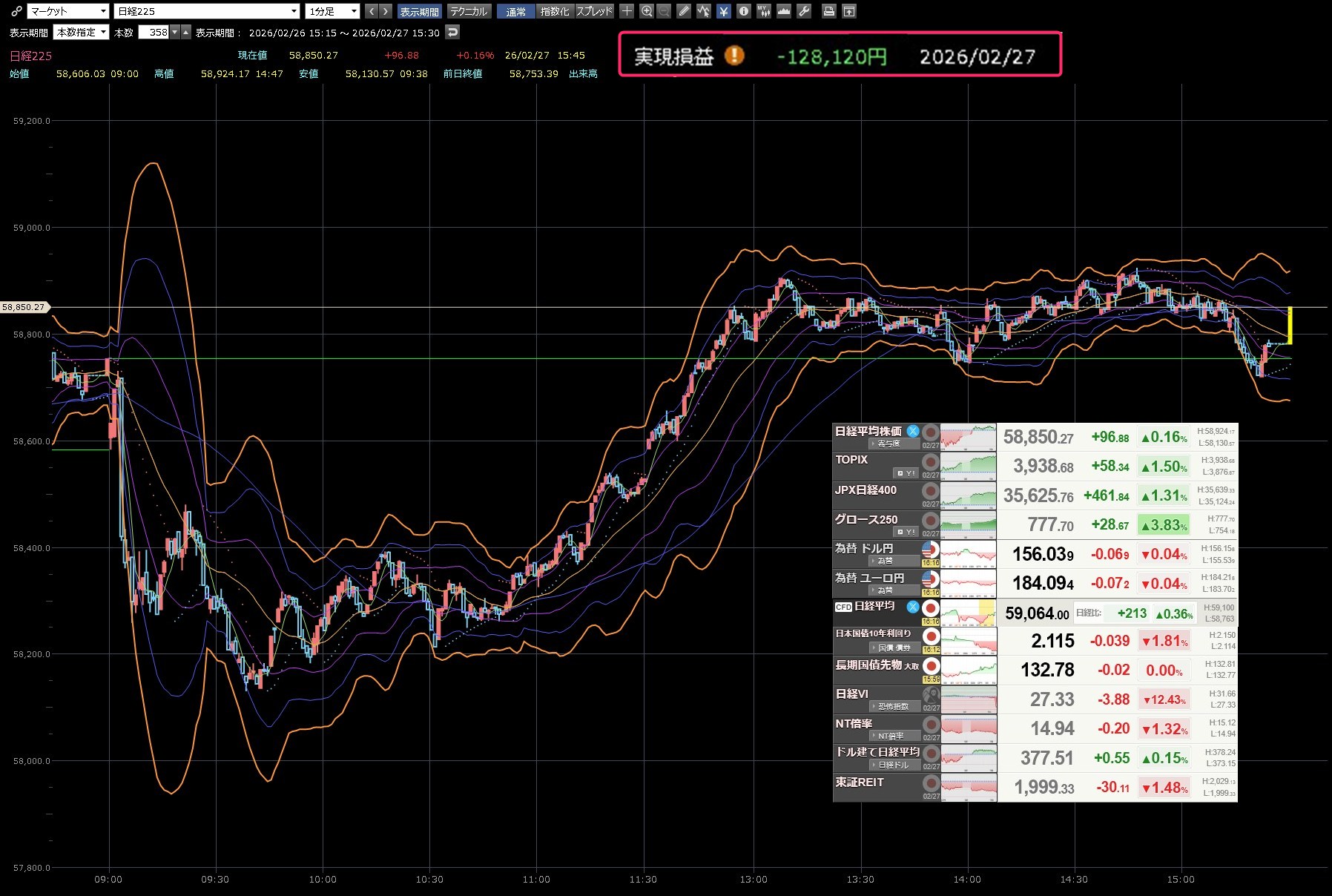 本日のデイトレ結果と日経平均の1分足は以下のとおりです。史上最高値更新ですね。何処まで上がるのでしょうね。ワイも安川もって大人しくしておけばよかったですよ。ただね・・・チャートでパラボリック暗転してて、デッドクロスも発生してたからね・・・すぐに投げてしまったんやねん。仕方ないね。こればっかりわ・・・しゃーないわ。