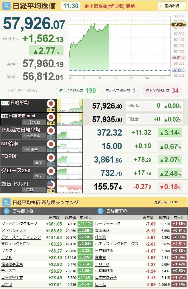 引けはどうなんだろう・・・以外に下げるんじゃないかな。陰線つけそうな予感はしなくもないでCFD現在+4000超えてるもん。おかしいって58325やで・・・流石に57000台でしょう。これは行き過ぎや。KDDIなんてある意味 日本電産よりもひどいよ。 S貼り付きでもおかしくない不正やで!逮捕案件や。そうじゃないとホリエモンが納得しないでしょう。