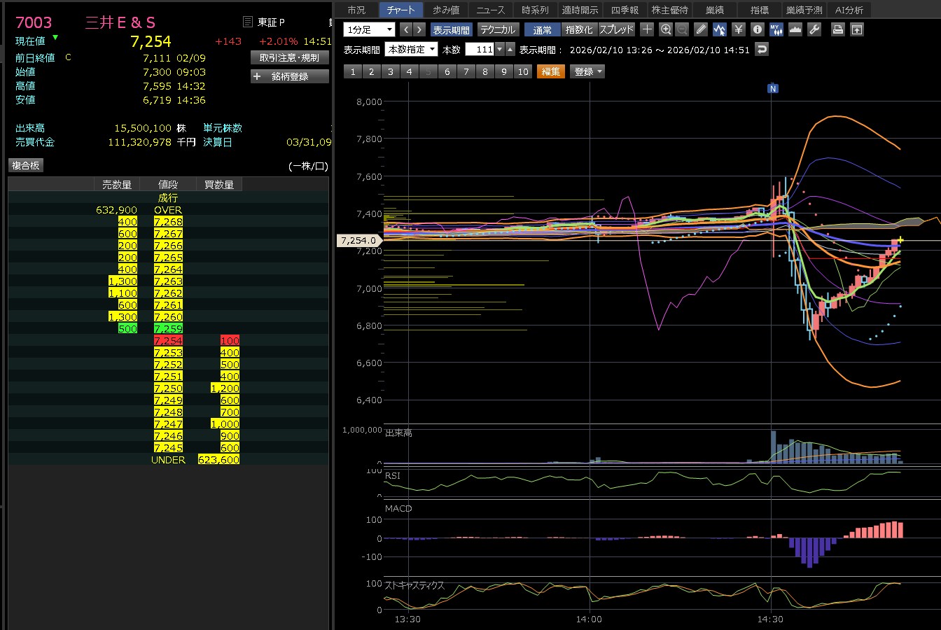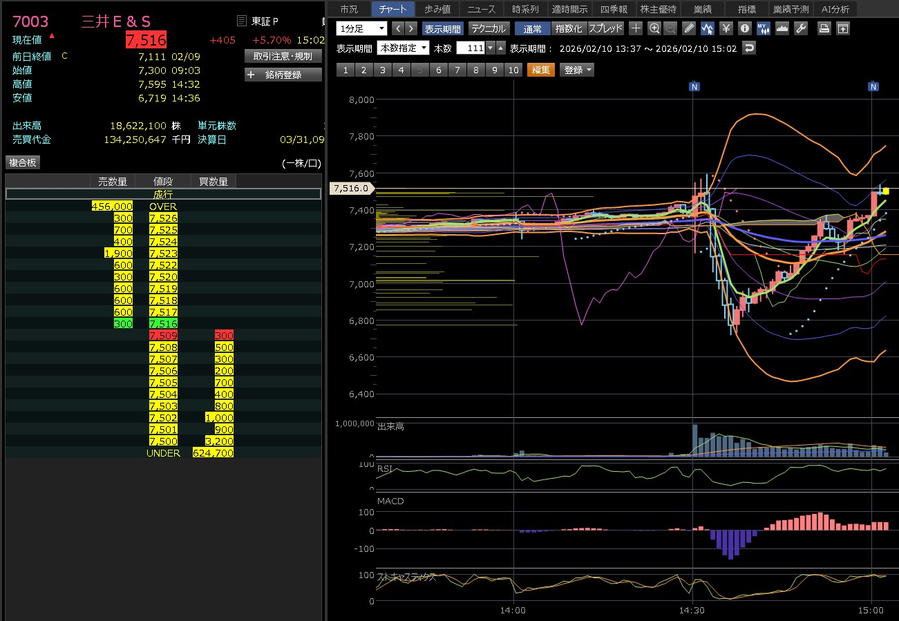 ザラ場(日中)で一時 8,040円 の高値をつけましたが、引けにかけて 7,612円 まで押し戻されています。