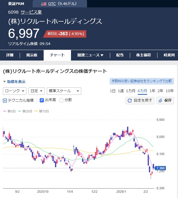 昨日の決算はリクルートはやはり良かったけれど、アンソロピックショックで買えなかったんや。全く関係ないと思うのですが影響がでている以上手が出なかった。まぁこれは仕方がない。指を咥えて上昇を見ているよ。