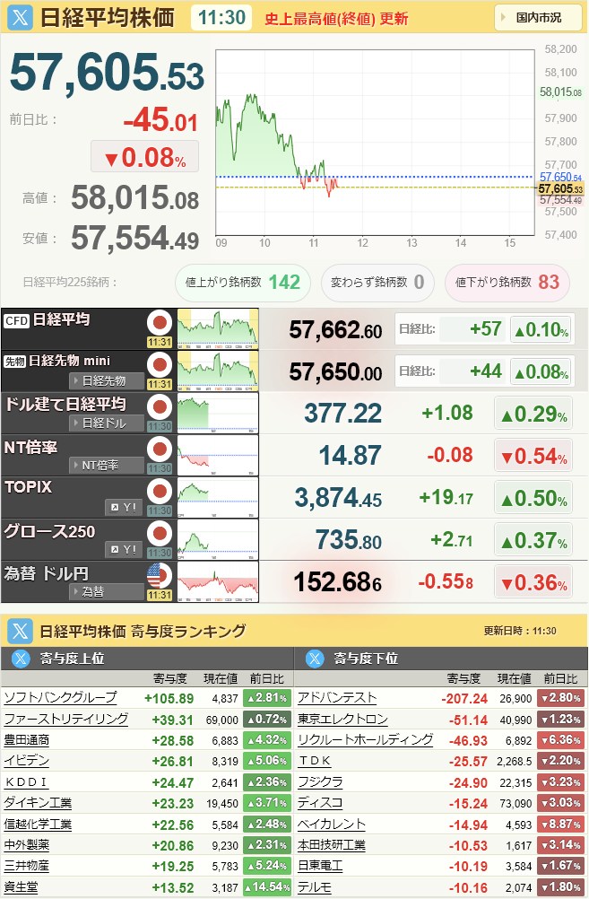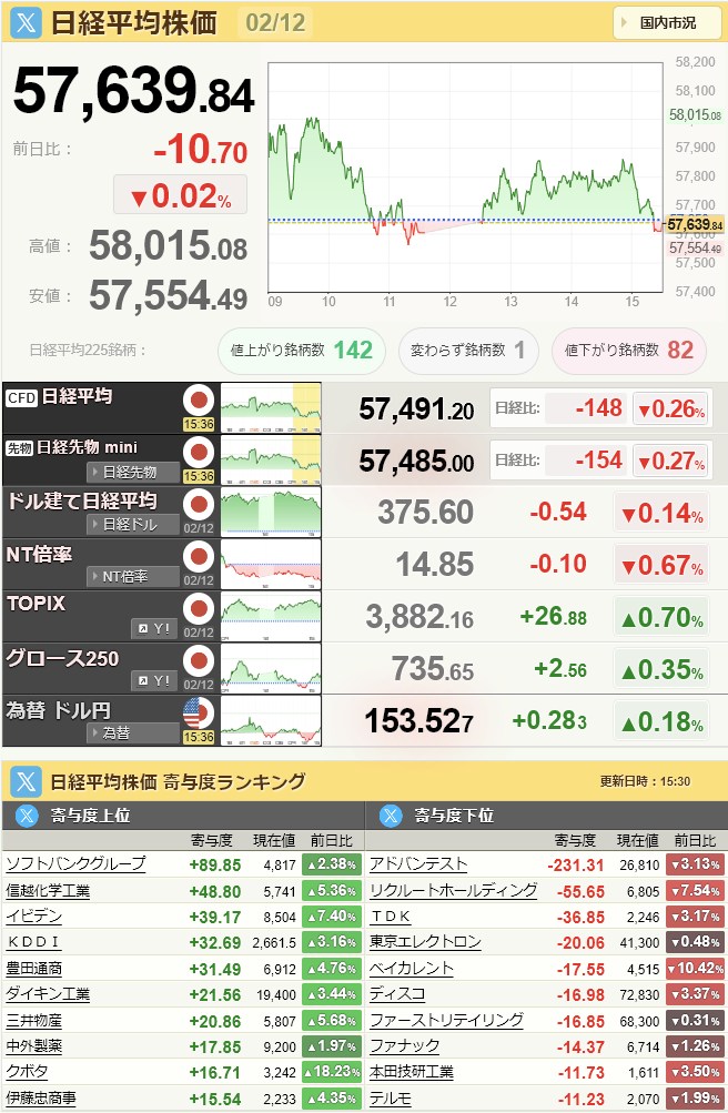 日経平均57,639.84-10.7-0.02%[15:45]米ドル/円153.04-0.18-0.12%[16:20]