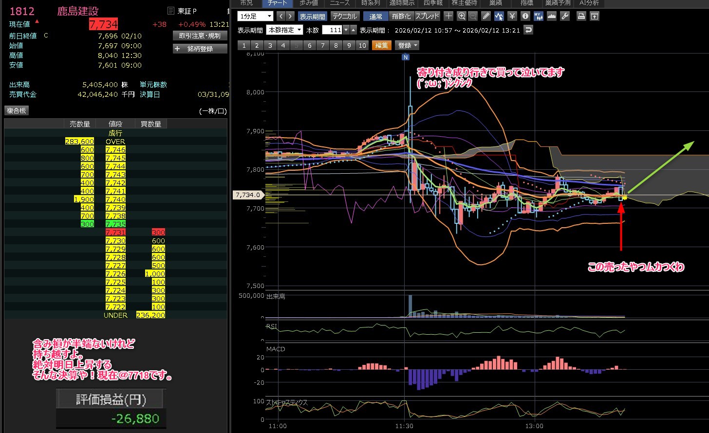雲抜けて、そろそろ上に弾けそうなチャートしてるで・・・ちょっとまた目を離すことにする・・・まだまだ含み損っすわ。14:30にもう一度見に来ます。下げは早いわホンマに・・・7750で落ち着いてきたかな。次は7800超えて欲しいわ。