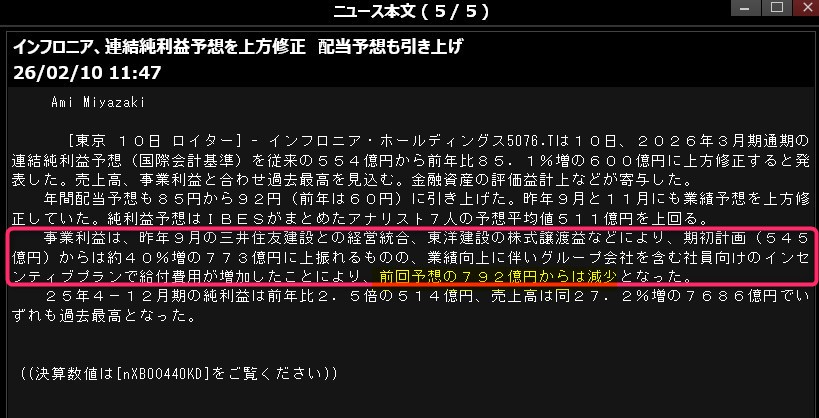 キオクシア、ソフトバンク、サンリオと決算良いですね。なのにCFDがマイナスなのはなんでなん?日経はソフトバンクが上げるやろ?違うの?まぁええけどね。鹿島が上げてくれたらそれでええわ。よく似た銘柄でインフロニアHDがあるけれど、ここは決算コンセンサス以上でも下落してるのは当初発表していた利益が下げられたからやろうね。