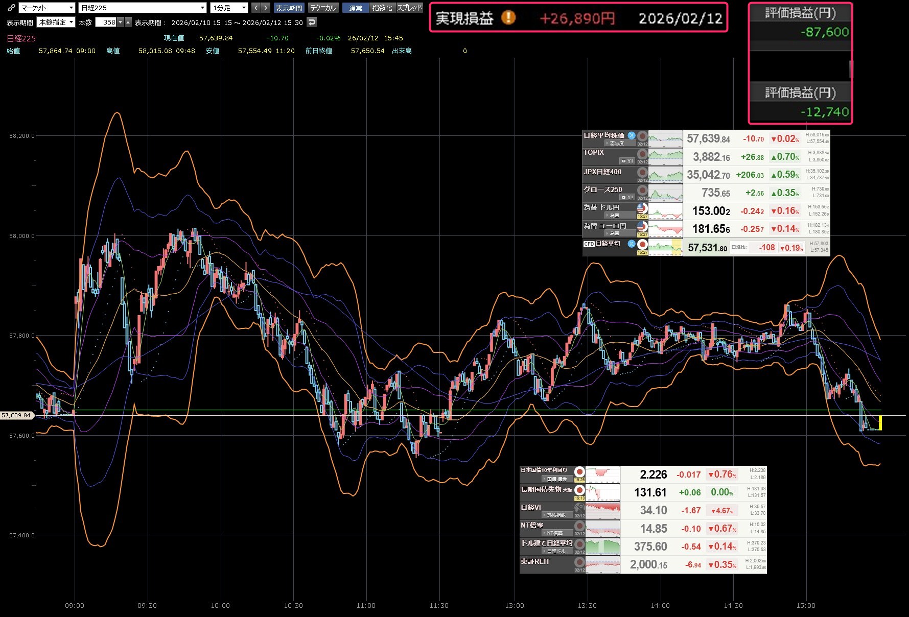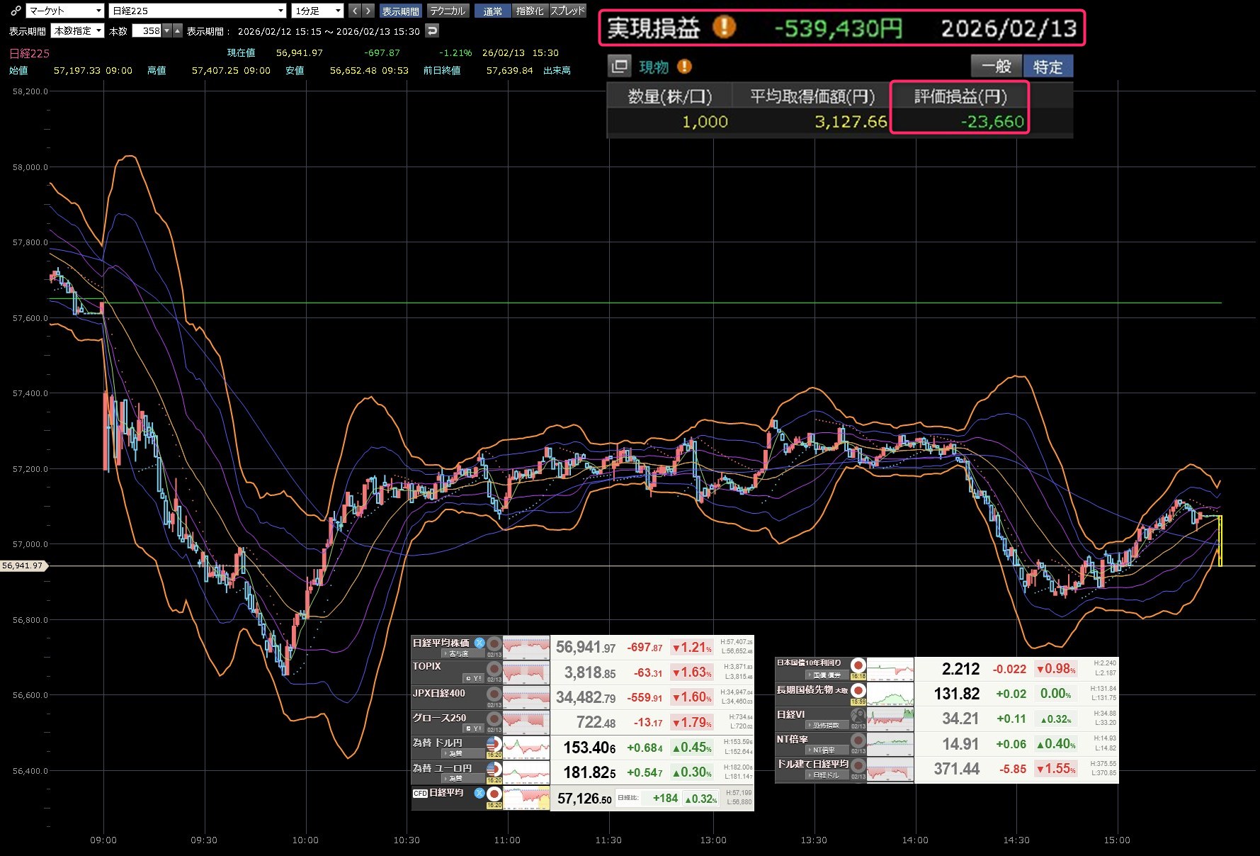本日のデイトレ結果と日経平均の1分足は以下のとおりです。 今日は前場になんていうのか・・・散歩に出てしまった・・・本来なら余裕のロスカットしてるのに。。。散歩に出てたためできませんでした。早歩きで返ってきて速攻でロスカットしました。そこからなんとか・・・▲68万円を▲54万円まで回復させました。