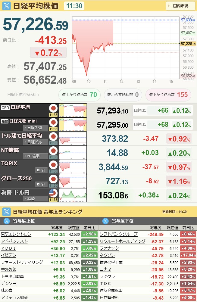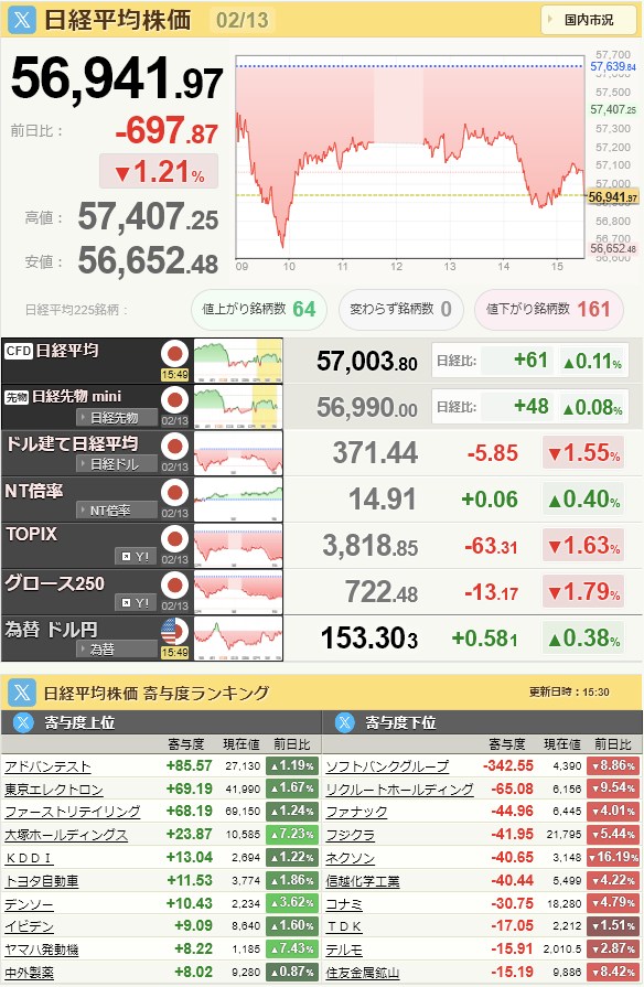 日経平均56,941.97-697.87-1.21%[15:45]米ドル/円153.38+0.65+0.43%[15:59]