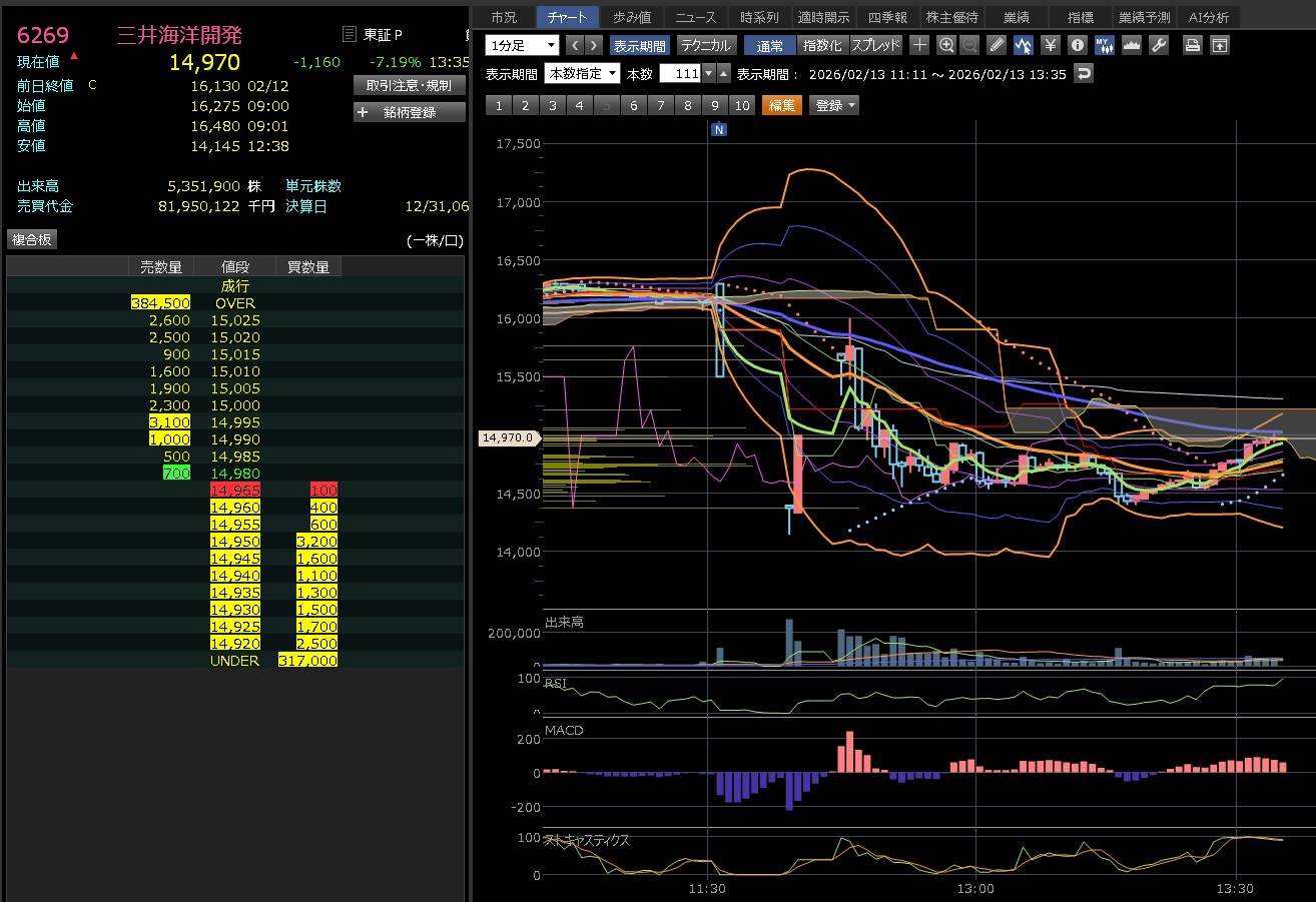 この「約430円もの長い上ヒゲ」は、8,000円の節目で強力な**「利益確定売り」や「やれやれ売り」に押されたことを意味します。テクニカル分析では「相場の転換点(首吊り線や塔婆に近い形)」**と見なされることが多く、短期的な天井打ちの可能性が高い形状です。
