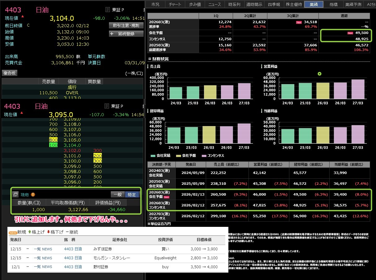 TOYOTIRE @4400回復したんや・・・今は割り込んでるけど・・・ホンマにしくじったわ。これなら・・・40万抜けたで!14:00過ぎまで保有してたらね。ただ、信用やったんでそこまで我慢出来ないわ。とりあえず、持ち越します。日油・・・含み損も随分とヘッタで!3660円や。@3124