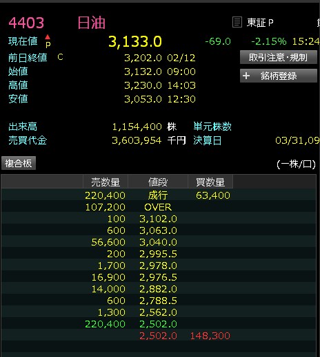 また日経下げてきた。順調に上げてなのにね・・・なんか日経に連動する日油。出来高少ないのになんでやねん。せっかく含み損消えたのに・・・