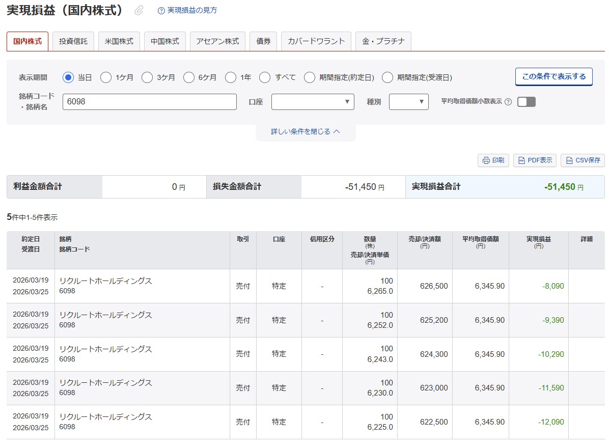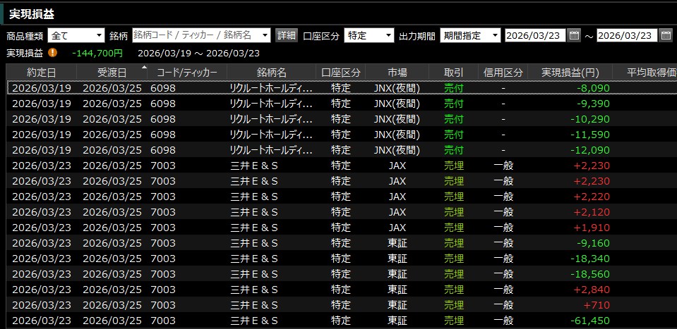 本日の取引は以下のとおりです。リクルートのPTSのロスカットも加味されて▲144700ってね・・・終わってるわ。