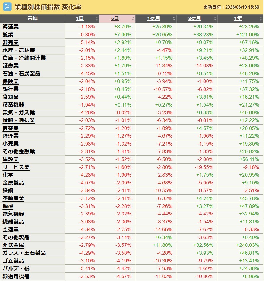 先週の業種別騰落率は以下の通りでした。こういうときは海運が上がると知っていただけに残念や。ってか事件後すぐには上がらんかったからあれって思ったんや。そして鉱業・・・あれだけ原油が上がればね。そしてそれを販売する商社(卸売業)よ。ま、妥当な業種別ですね。