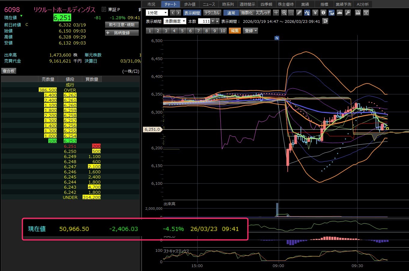 日経▲2400安って何なん?これ・・・酷いわ。それやのにリクルート頑張ってるやん。ワイの持ち株10%以上下げてるで!ここまで下げるなんてね。含み損も13万円やわ。もう知らん。持ち続けるわ。終わったな。ワイ・・・ホンマに波瀾の3月やな。