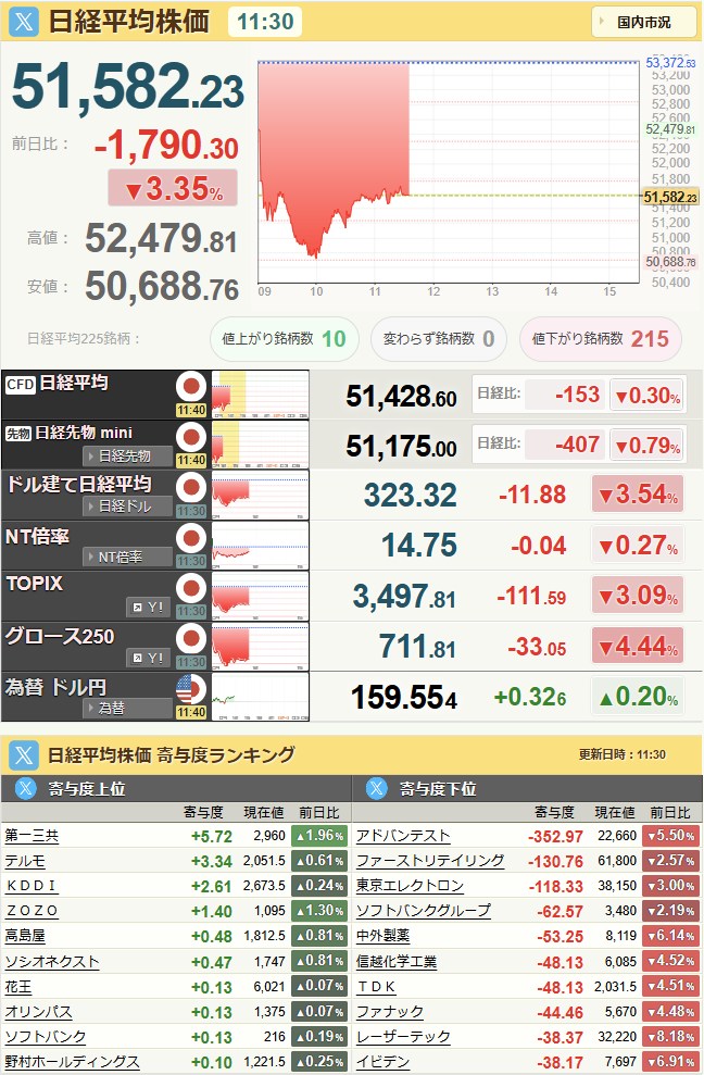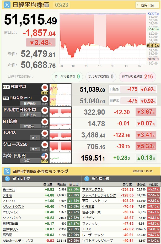 日経平均51,515.49-1,857.04-3.48%[15:45]米ドル/円159.45+0.23+0.14%[16:09]