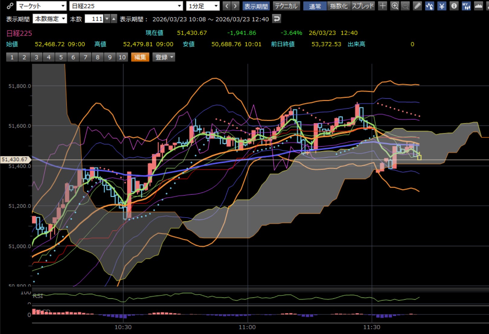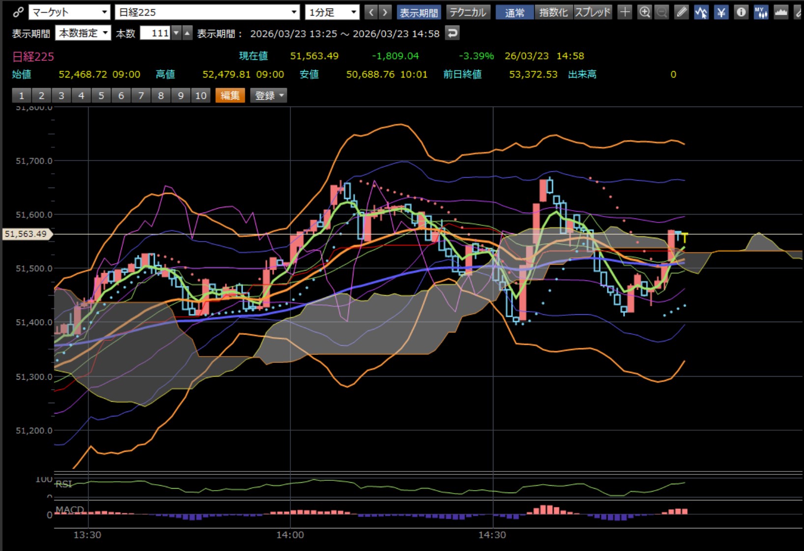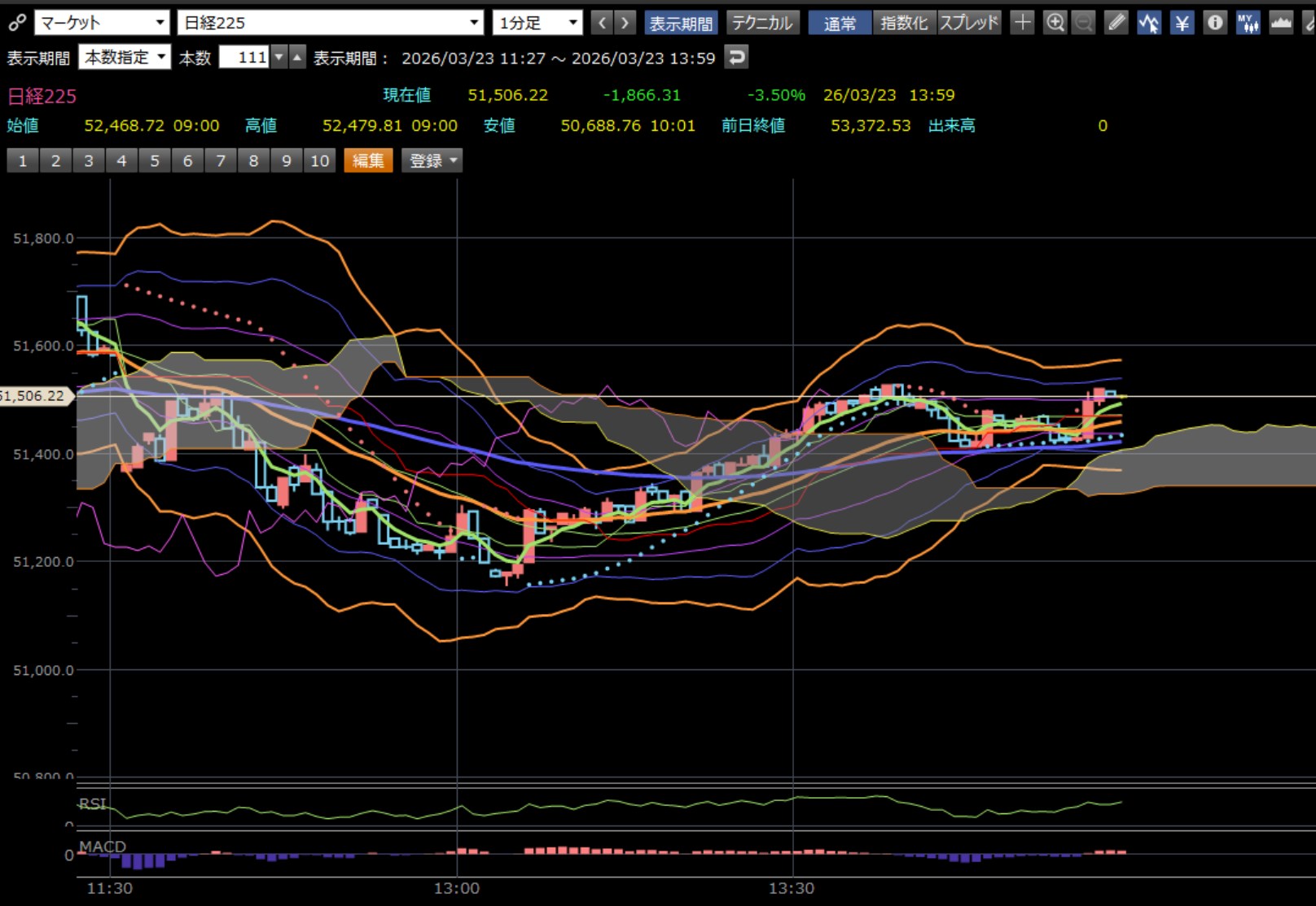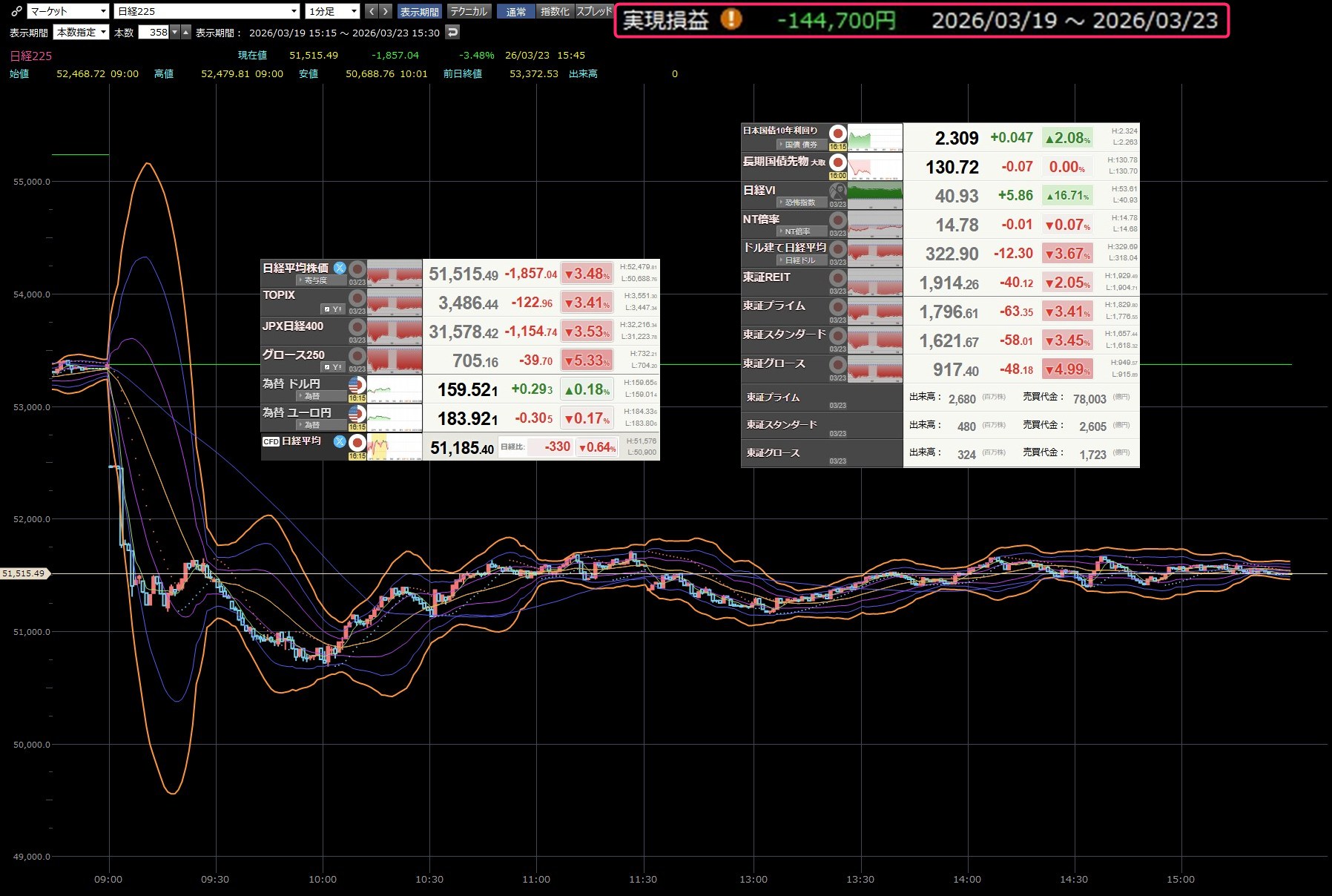 本日のデイトレ結果と日経平均の1分足は以下のとおりです。