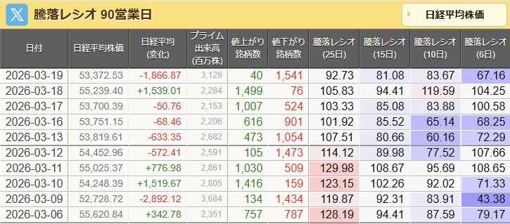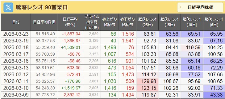 大川がラジコで弱気な話ばっかりするから落ちるんちゃうんか?アホちゃうか・・今日は買い持ち越しでええわ。騰落レシオ見てたら、今日も下がるはずやし、ここから52000まではいってほしいな。