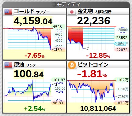 菌が半端なく下げてますね。5500いってたようなきがするのですけどね。流石に戦争で金まで下げだすと、リーマンやらコロナやら思い出されますね。みんなポジションをキャッシュにするというね。にしても一部持ち越してしまったよ。まぁ耐えられる範囲ではあるのですけどね。