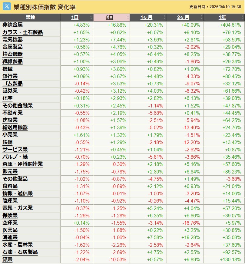 先週の業種別騰落率は以下の通りでした。電線祭りっすね。なんでこんなに上げんの?って感じですわ。