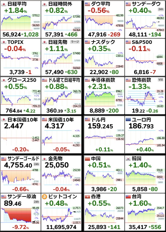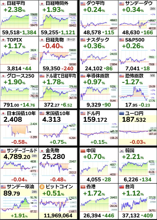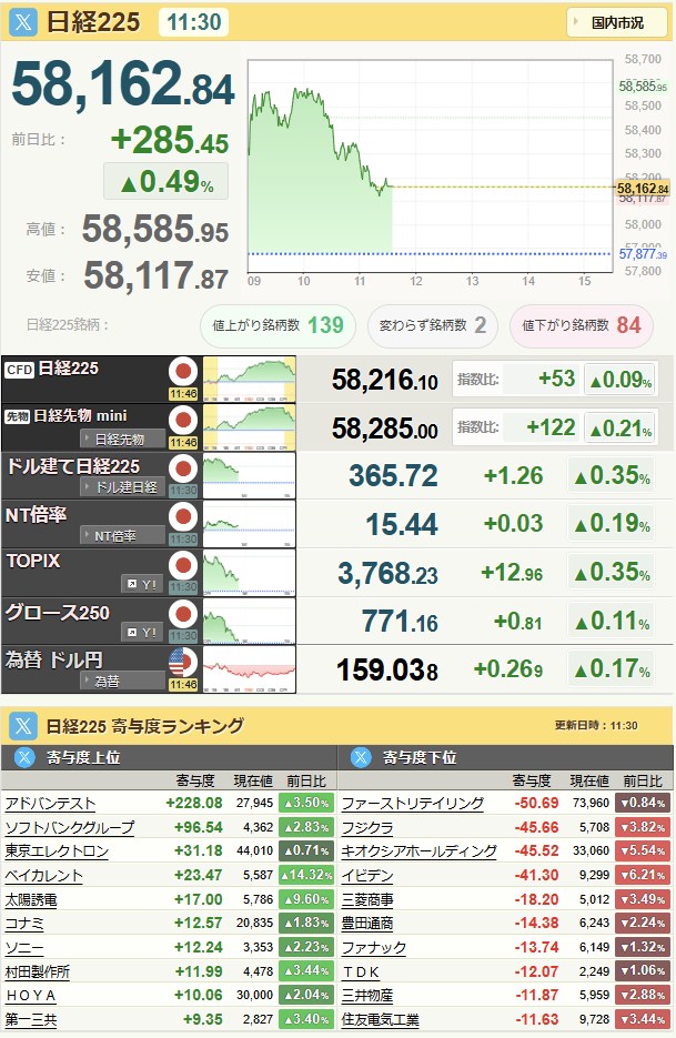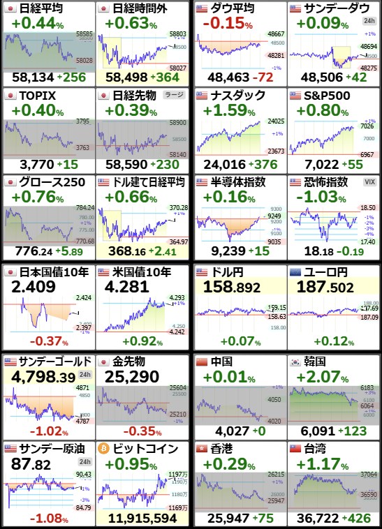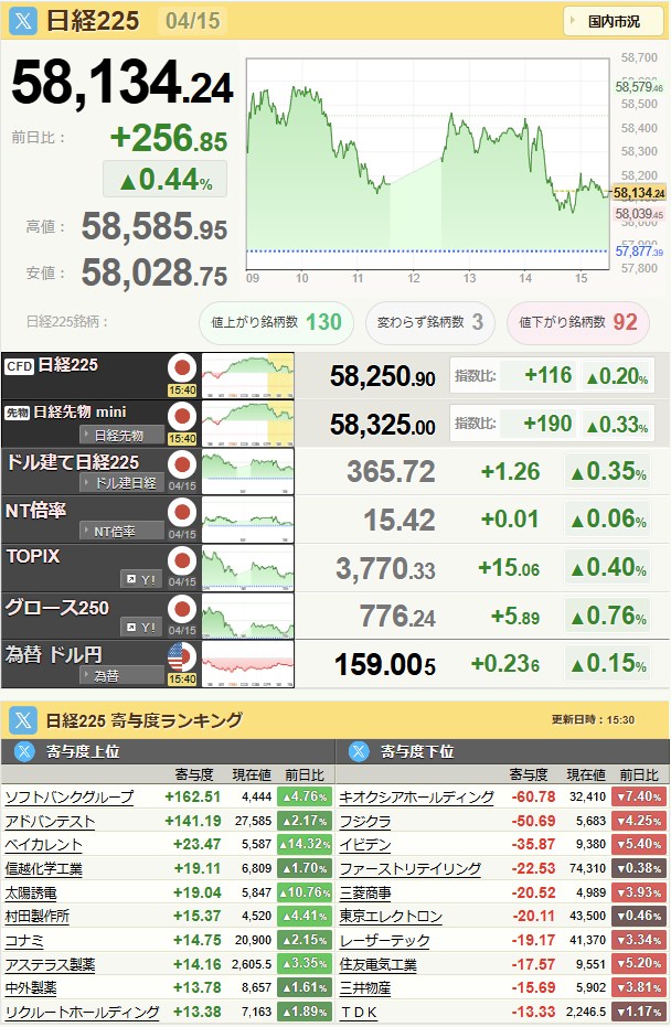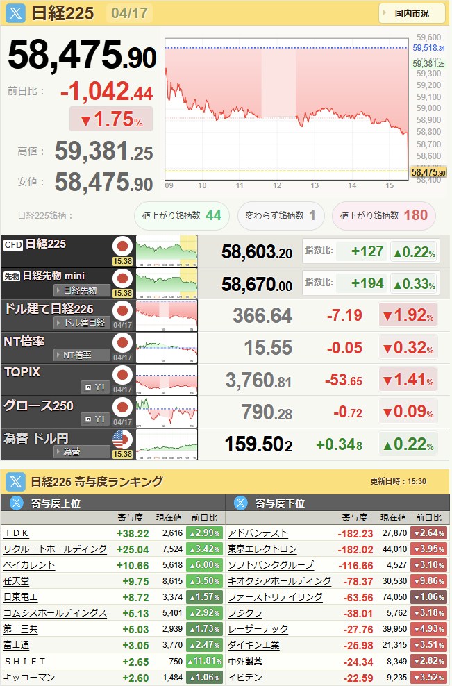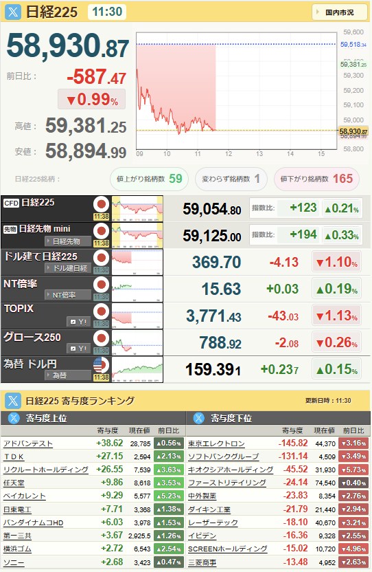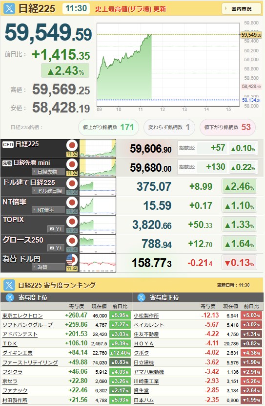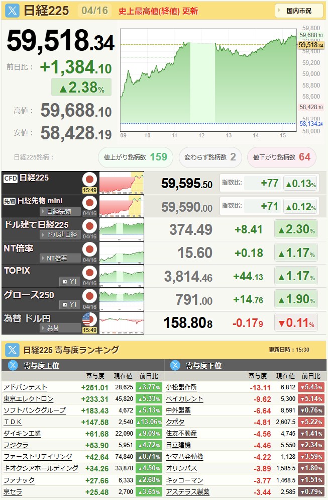 日経平均59,518.34+1,384.1+2.38%[15:30]米ドル/円158.88-0.09-0.06%[15:30]