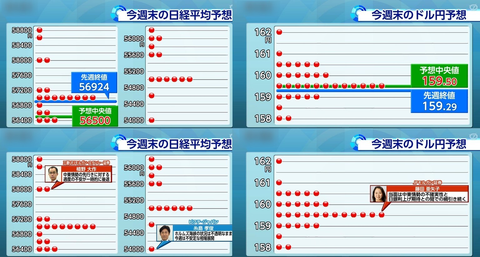 ここまで来たらイランをとことんやってしまうのが良いと思う。そして体制を交代することがイランのためにもいいと思うんや。もともとイランは革命防衛隊に沿わない人間を殺してきた独裁国家よ。そんな国は無い方がええよ。なんて思いながら今週末の日経平均・為替のプロに寄る予想は以下のとおりです。ワイは「58300@158.5」を予想するで!