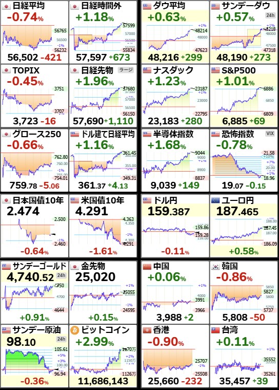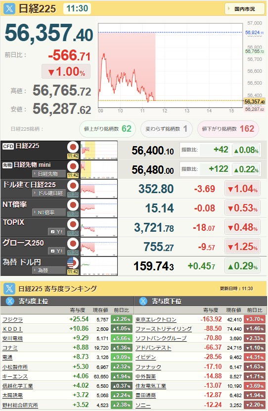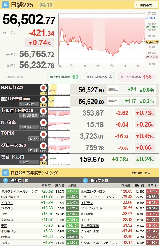 日経平均56,502.77-421.34-0.74%[15:30]米ドル/円159.66+0.47+0.3%[15:40]