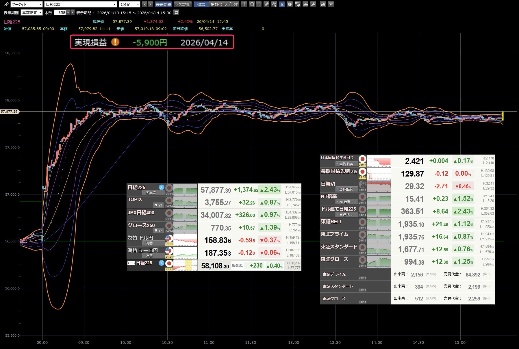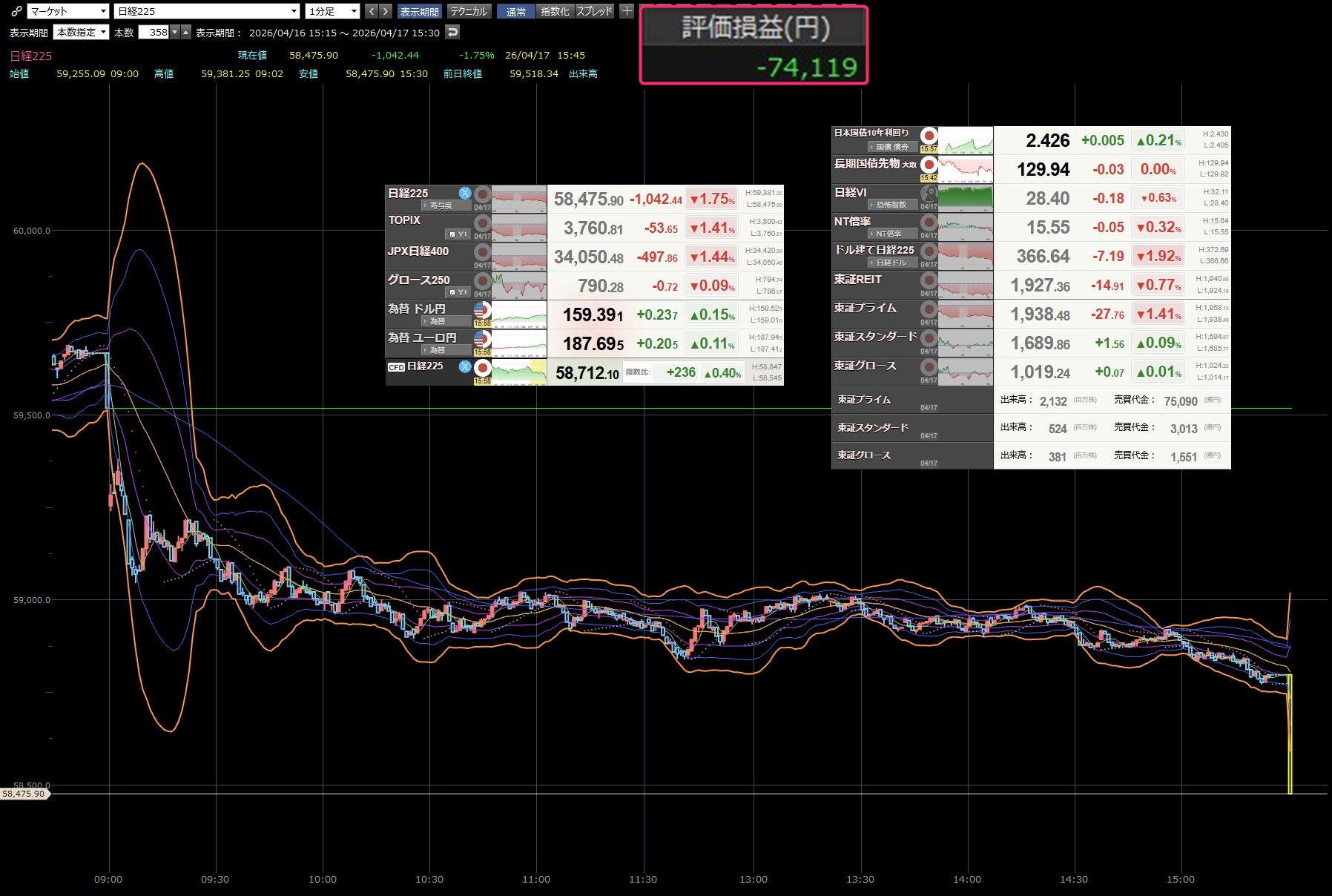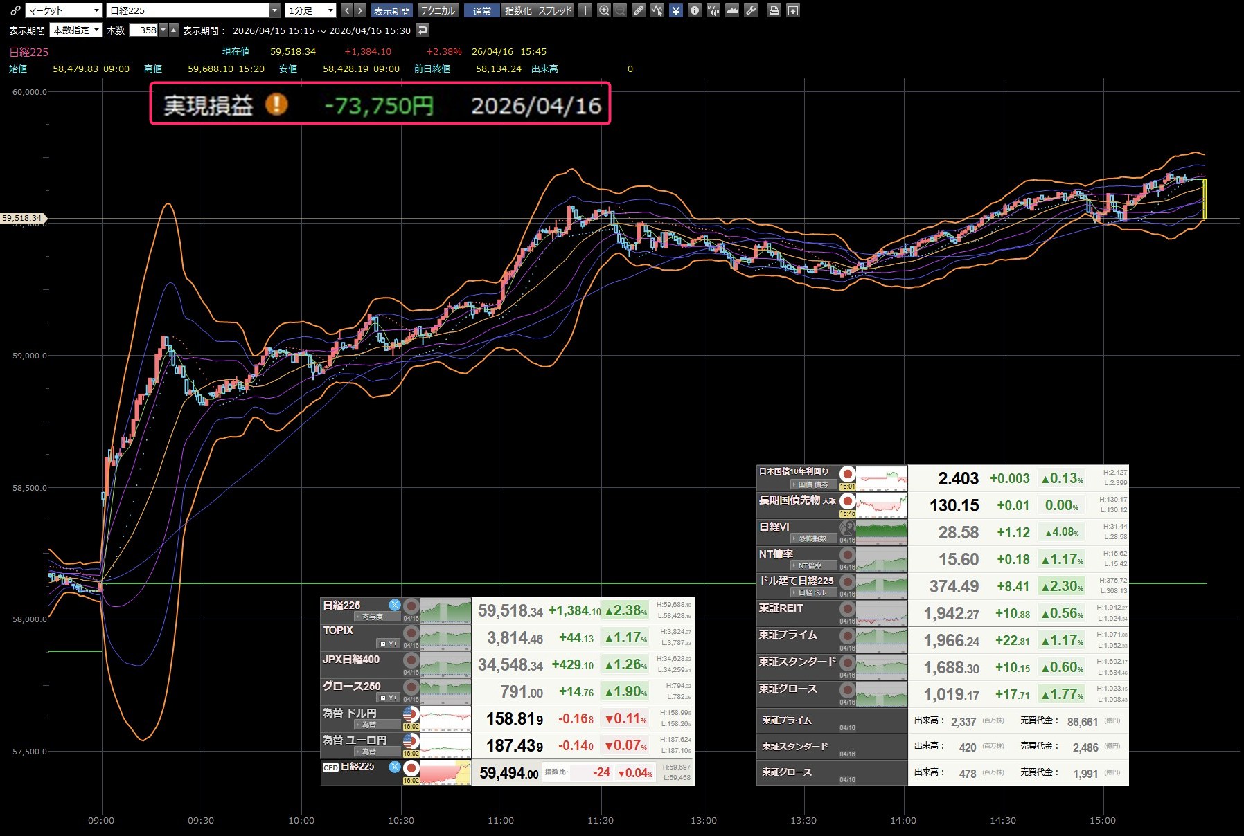 本日のデイトレ結果と日経平均の1分足は以下のとおりです。お遊びでデイトレして日経があれだけ上げてるのに大損です。