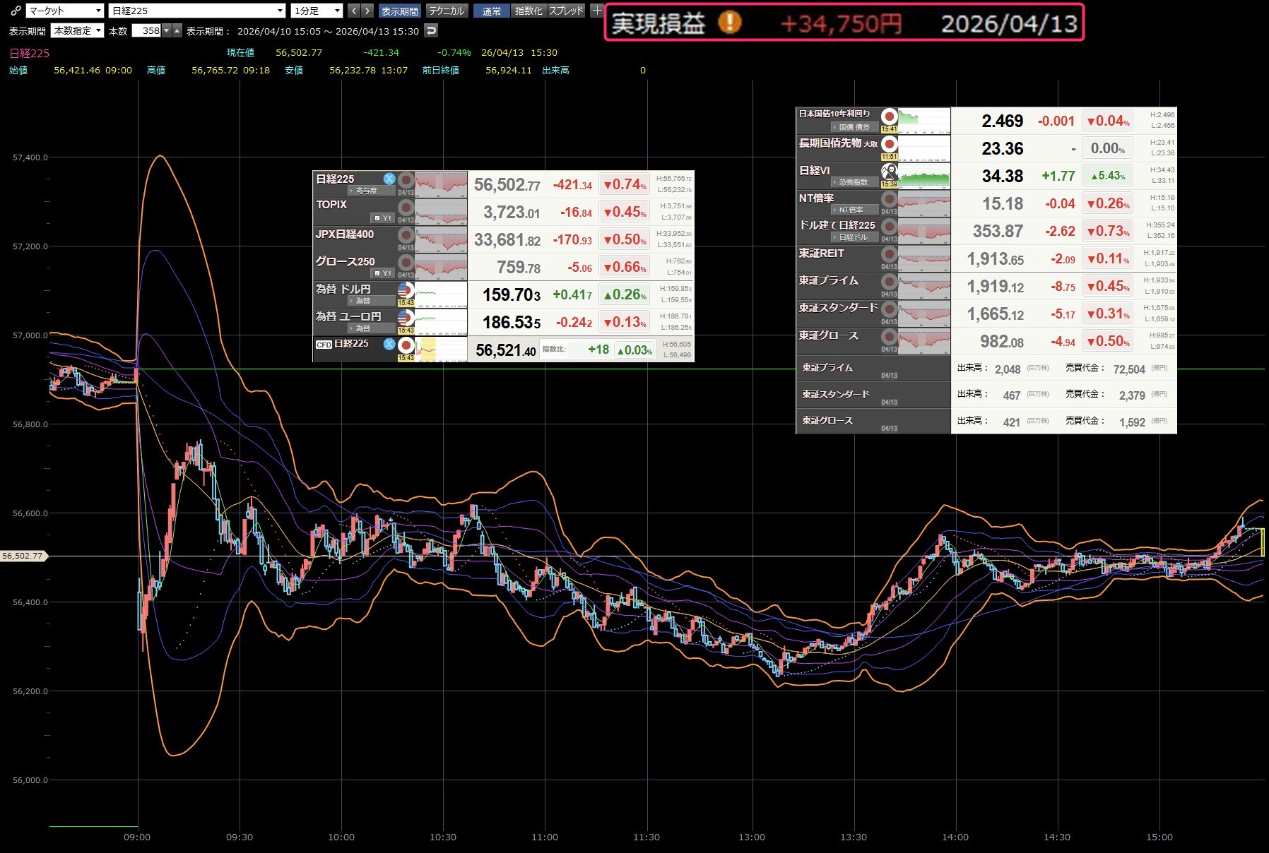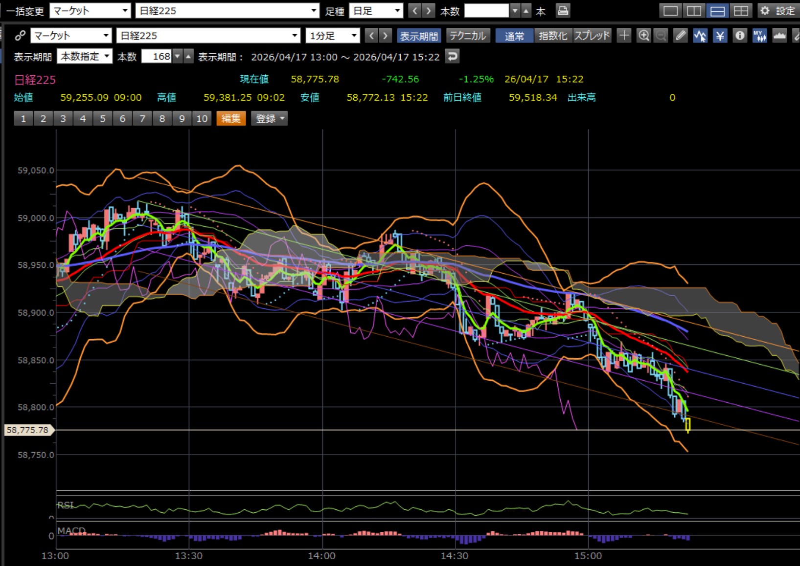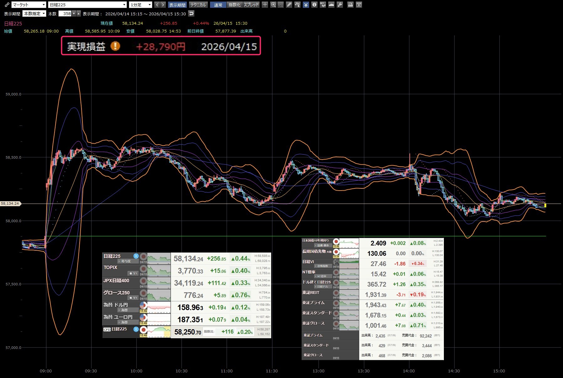 本日のデイトレ結果と日経平均の1分足は以下のとおりです。お遊びでデイトレして日経があれだけ上げてるのに大損です。