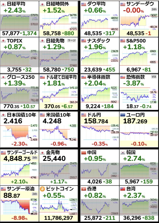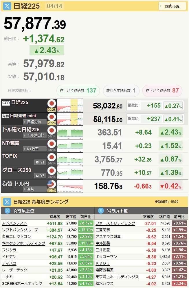日経平均57,877.39+1,374.62+2.43%[15:45]米ドル/円158.81-0.63-0.4%[21:19]