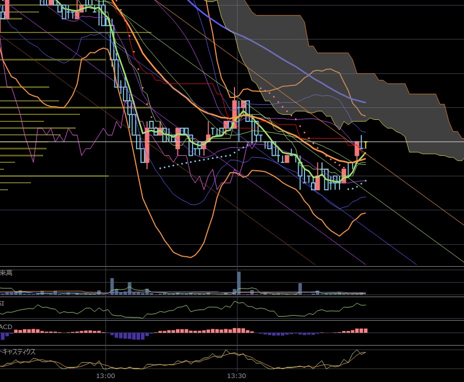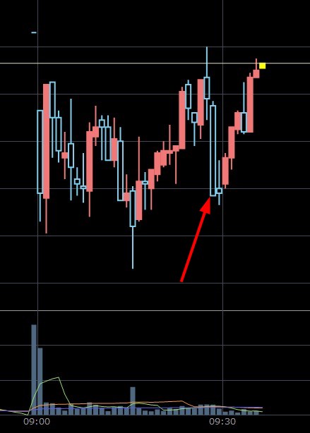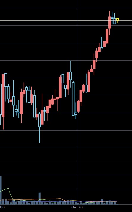 ワイが朝寄り付きで迷っていた銘柄・・・これやねん。まぁチャート分析してこれやなって思ってたんや。ただ、最初にとんがりコーン決めてるからそこで投げてしまってる可能性はありますけどね。