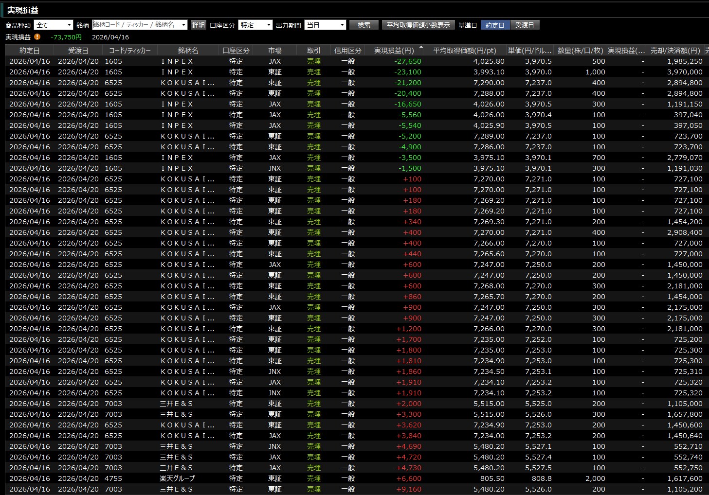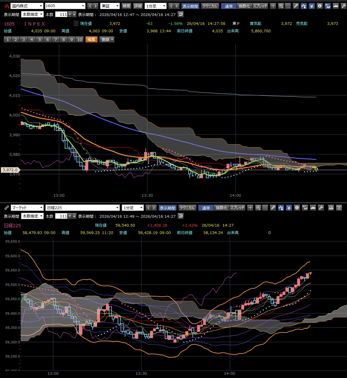 本日のデイトレ結果と日経平均の1分足は以下のとおりです。今日は半導体株が強かった。それだけや・・・そんな日に・・・ワイはINPEXを買って大失敗。ストレスをためただけでした。そして半導体株で挽回しようとしましたがときすでに遅し・・・損の上塗りでした。今日の成績は▲73750です。。゚(。ノω\。)゚。ウワァーン
