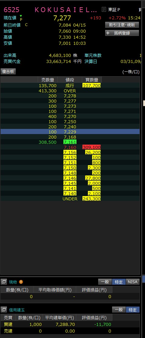 ワイの銘柄・・・チャートが買いに転換した。追加購入できなかったのが悔やまれるわ。後はKOKUSAIはロスカットしておいてよかった。3%以上下げるとはね・・・値動きあらいわ。