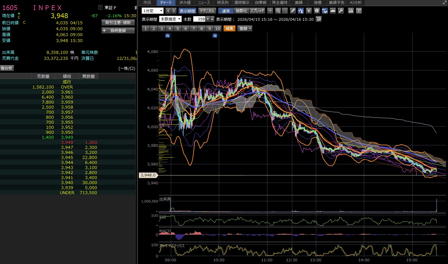 前場が始まりました。寄り付きに買って含み損です。何やねん。ただ、ワイは上げると見てるんやけどね。それにしてもINPEX4000超えてたんやね。あっという間にマイ転したけど・・・