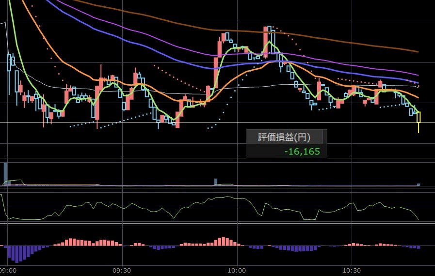 あかんわ。ワイの銘柄も下降トレンドに入ってしまった。ココから上げると思ったら下げ寄る。もったいないことしたわ。持ち越すからええけどね。+4万から含み損になりました・・・何やってんだか・・・