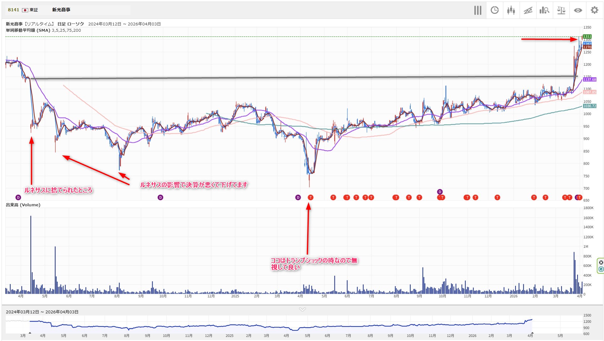 もう配当維持と優待を維持してくれるならずっと持ち続けますよ。参考までに新光商事の株価推移です。2年でもとに戻ってます。まぁ半導体が良かったというのもあるのですけどね。NISAだしよほどのことが無い限り10年持ちますよ。もともとルネサスには捨てられる予定で、配当目当てのNISAですからね。