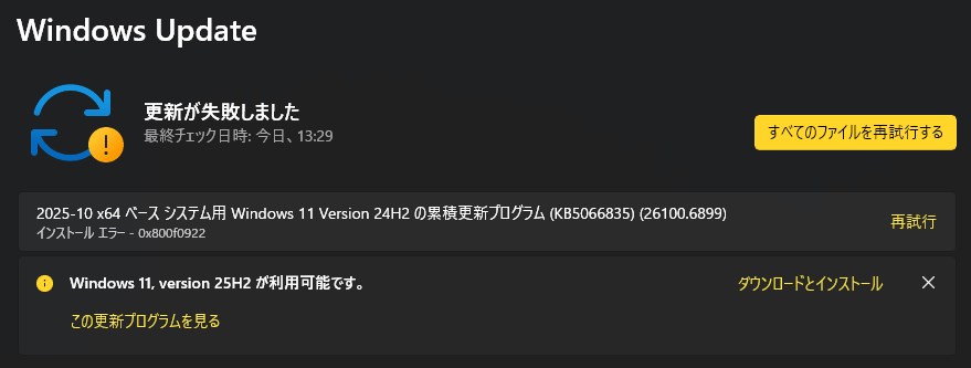 10/18になって自動更新が始まります。ワイは基本勝手に更新されるのを放置しているのですが、なんだか最近、Windows11 25H2 が更新プログラムにあるみたいで、やたらと更新されるものの、起動するたびにエラーが出て「変更を元に戻します」ばかりでWindowsの起動に時間がかかってしょうがない。 流石に、こんだけ失敗されると不安にもなるので本腰を入れてアップデートすることにした。