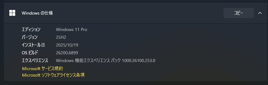 なぜか25H2がないのですよね。失敗したかなと思いましたが、Windowsのバージョンを見てみると25H2になってましたので安心です。上書きでインストールしたからかなって思ったりしています。